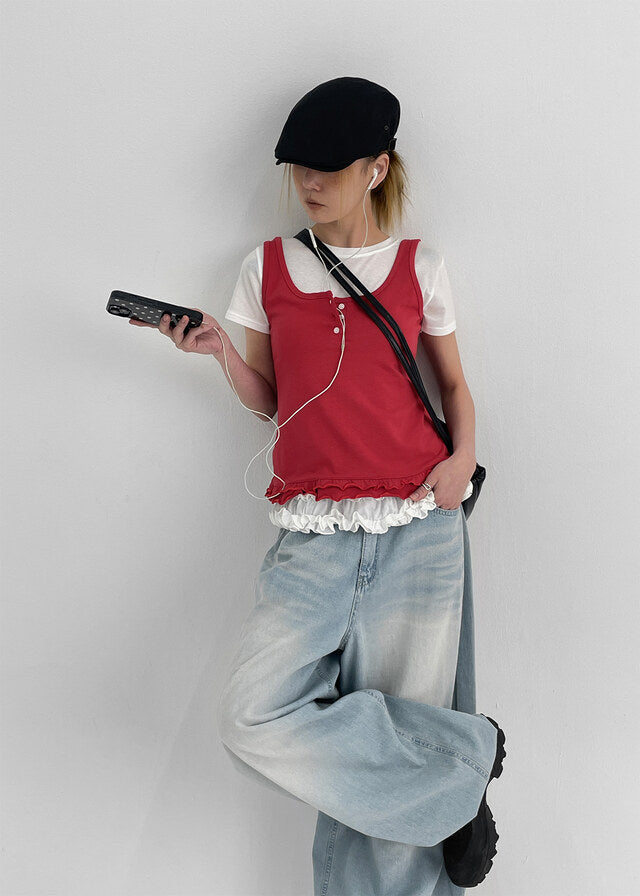 [้ๅ่ฃฝ้ ๐ฐ๐ท] Frill Henry Neck Tank Top / 2colors