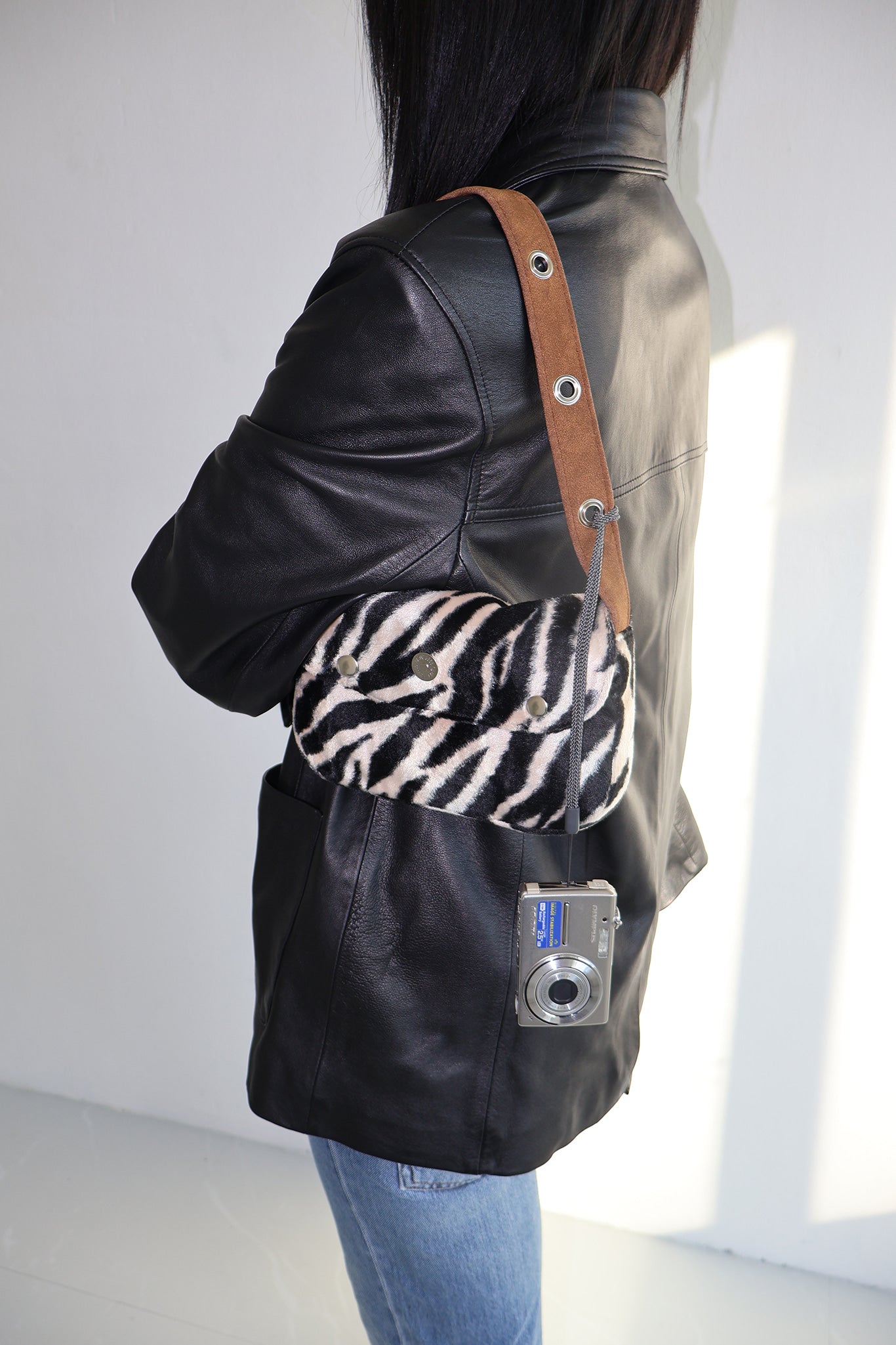 外層為麂皮質感設計,內側則為毛絨斑馬紋圖案,透過翻轉即可切換造型,為穿搭增添層次與趣味性。